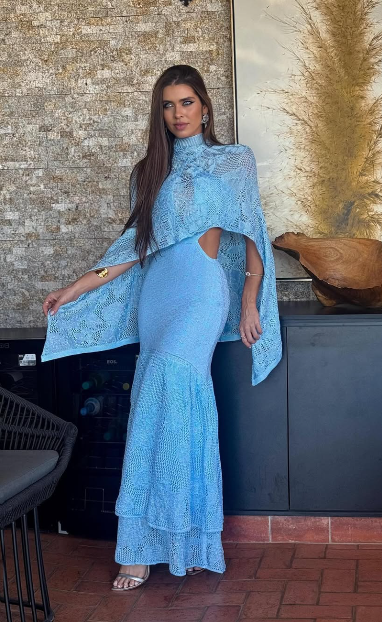 Turn heads in this exquisite light blue crochet maxi dress, crafted to capture both elegance and modern allure. Featuring intricate handmade crochet details, a bold cutout waist, and a statement bow-front neckline, this dress balances sophistication with sensuality. The flowing fringe hemline adds movement and drama, making it perfect for seaside dinners, summer events, or a glamorous night out.