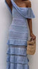The structured corset-style bodice enhances the silhouette with a flattering, sculpted fit, while the sweetheart neckline adds a soft, elegant touch. The layered ruffle hem brings movement and lightness, making it perfect for warm days and special moments.