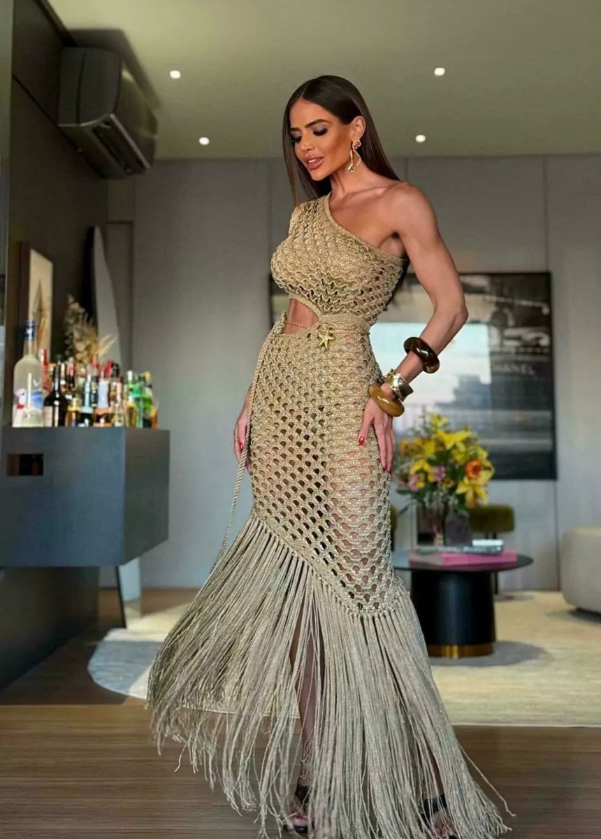 Designed with a one-shoulder silhouette and a strategic cut-out at the waist, it highlights the feminine shape with effortless allure. The fringe hemline adds movement and drama, making every step unforgettable — perfect for special occasions, vacations, sunset dinners, or elevated summer events.