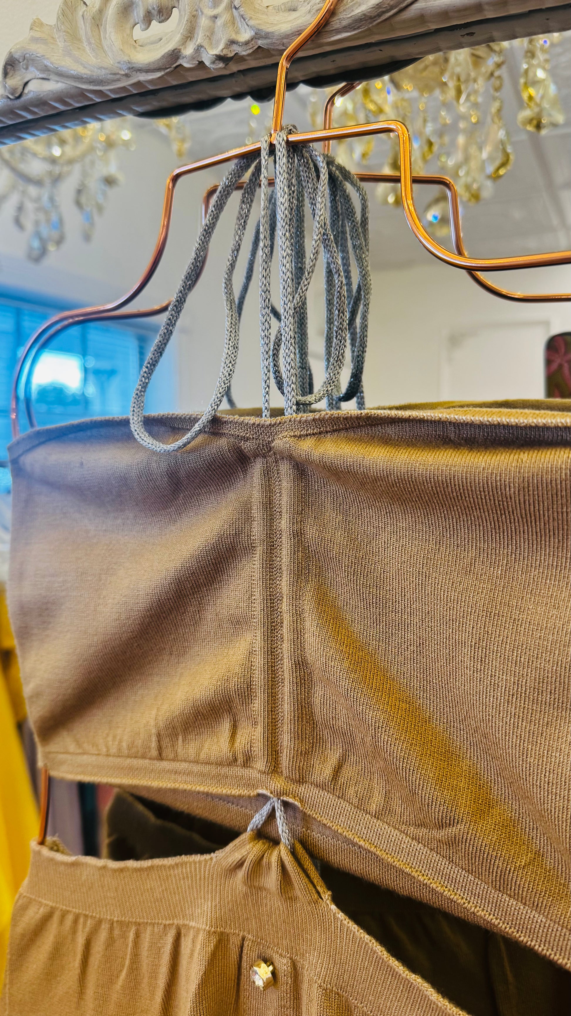 Make a bold entrance with this stunning strapless gold midi dress, designed to highlight confidence and elegance. Featuring a structured bandeau-style bodice with delicate cut-out details at the waist and a front button-down skirt, it creates a sleek and feminine silhouette that stands out in any occasion.