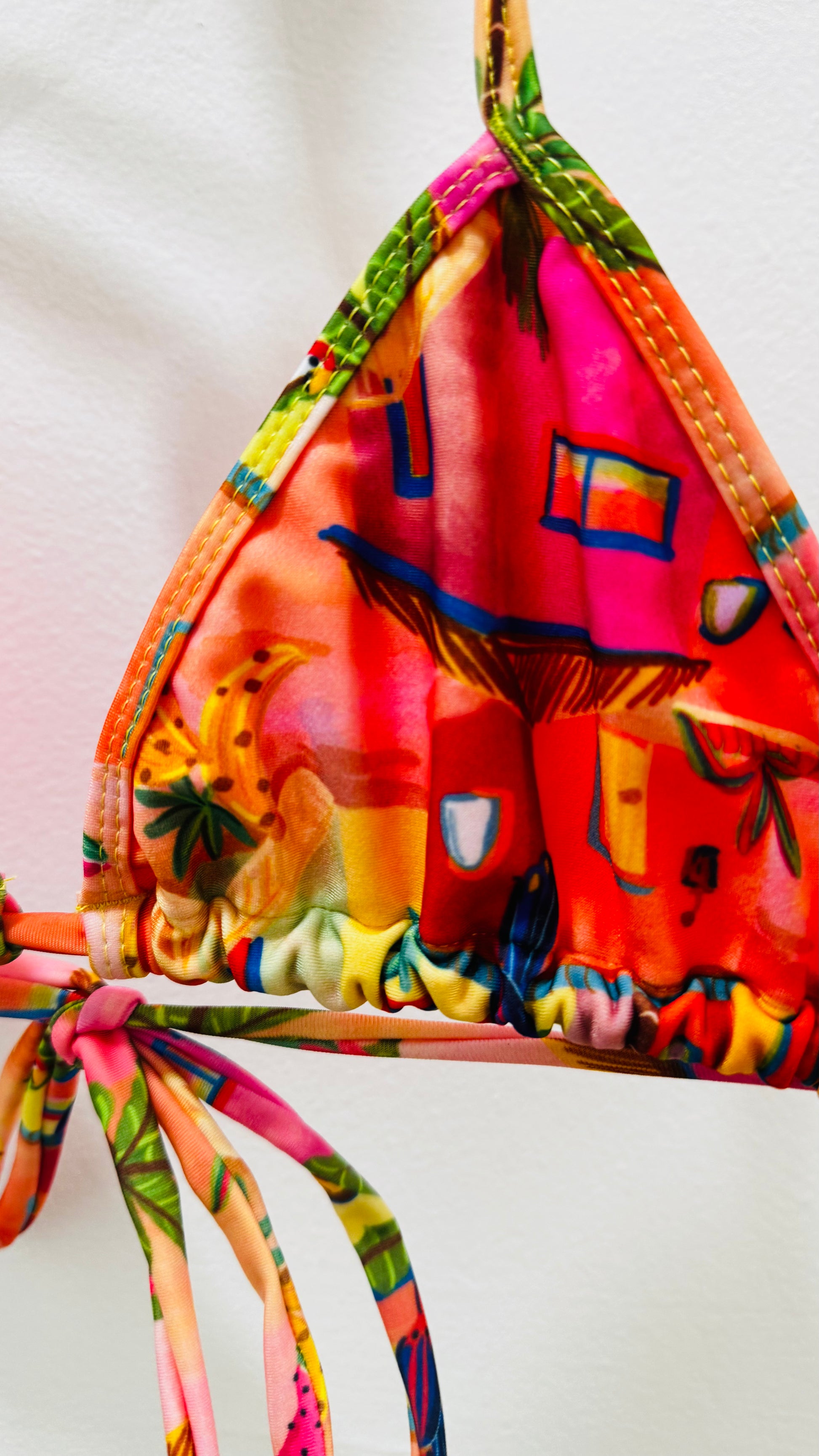 Bring the vibrant energy of Brazil to your beach days with this colorful bikini set. Featuring a bold tropical print with houses, fruits, and parrots in vivid shades of red, orange, green, and pink, this piece captures the essence of summer.
