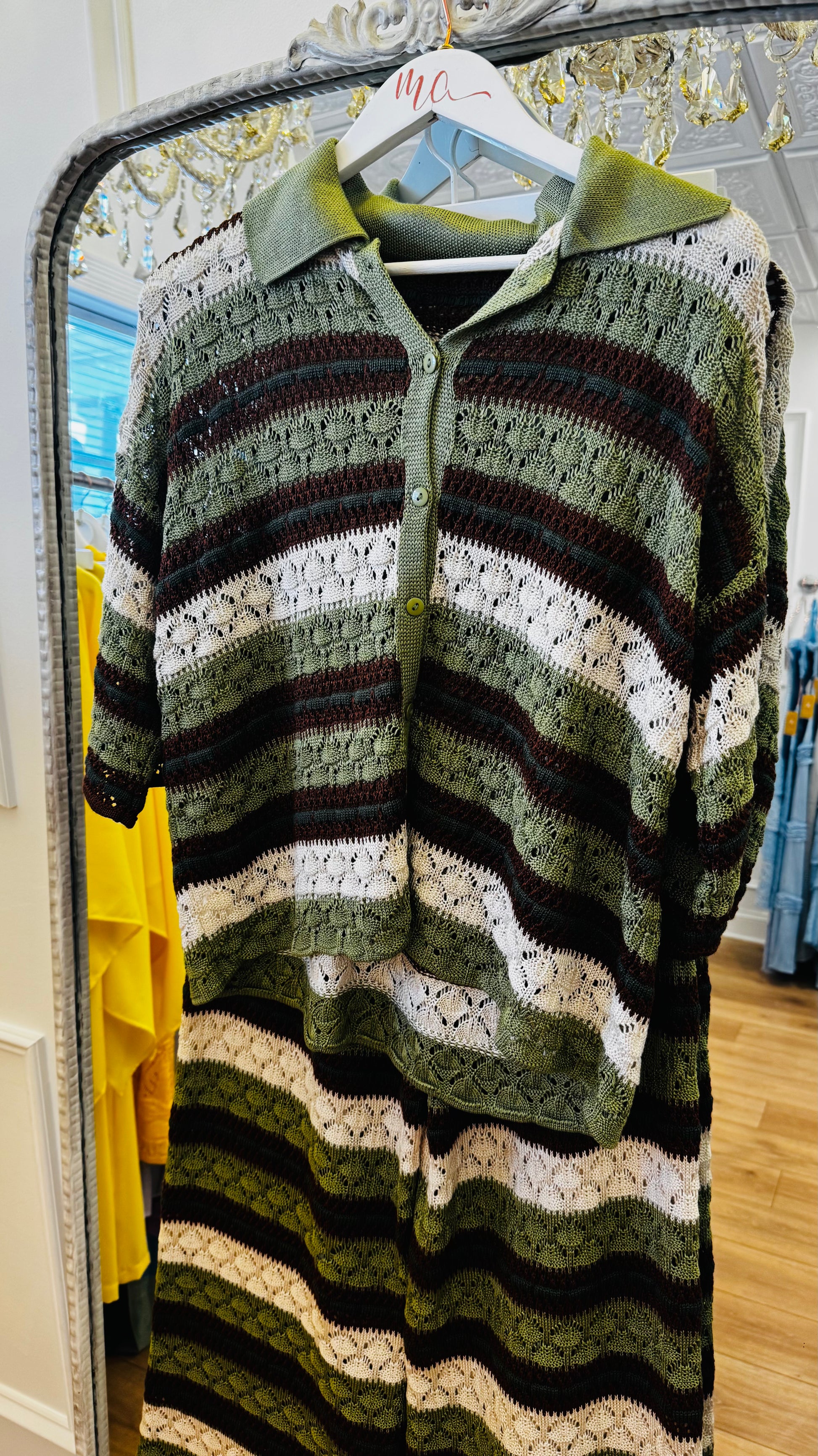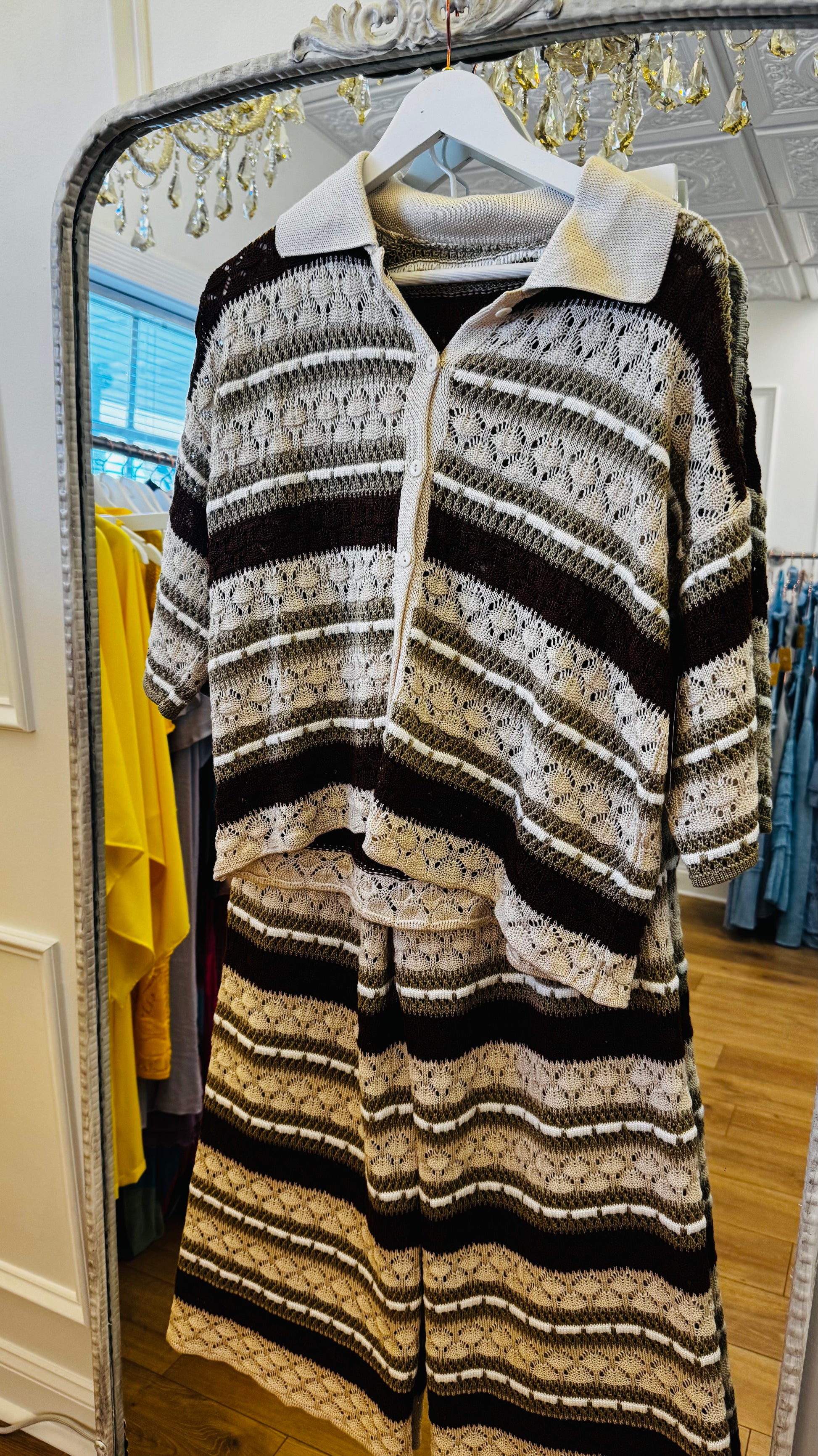An elegant and comfortable two-piece set crafted in lightweight crochet with intricate openwork details. The shirt features a classic collar and half-button front, combining casual charm with timeless sophistication. The wide-leg pants provide a relaxed yet polished silhouette, ensuring both comfort and style.