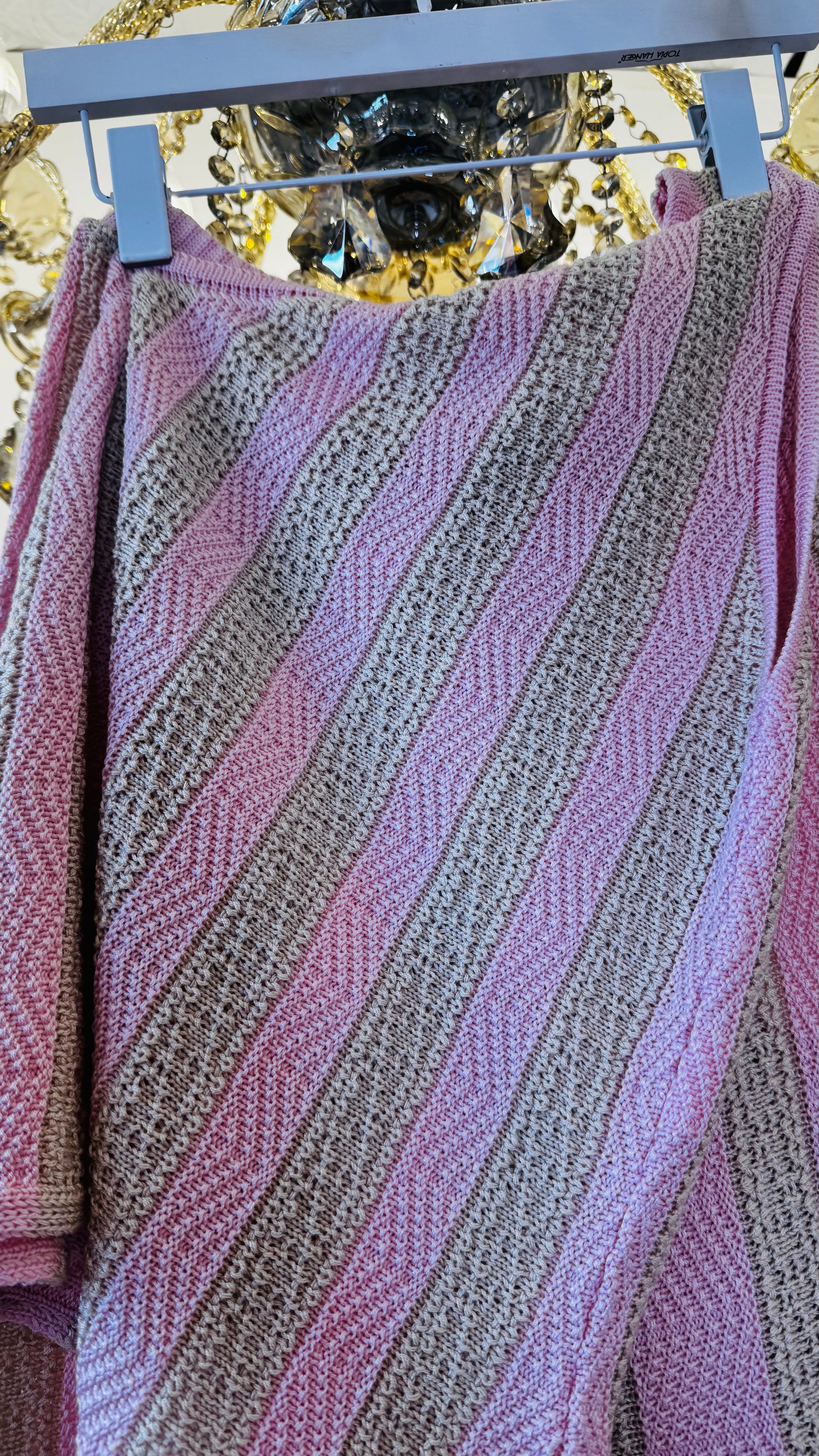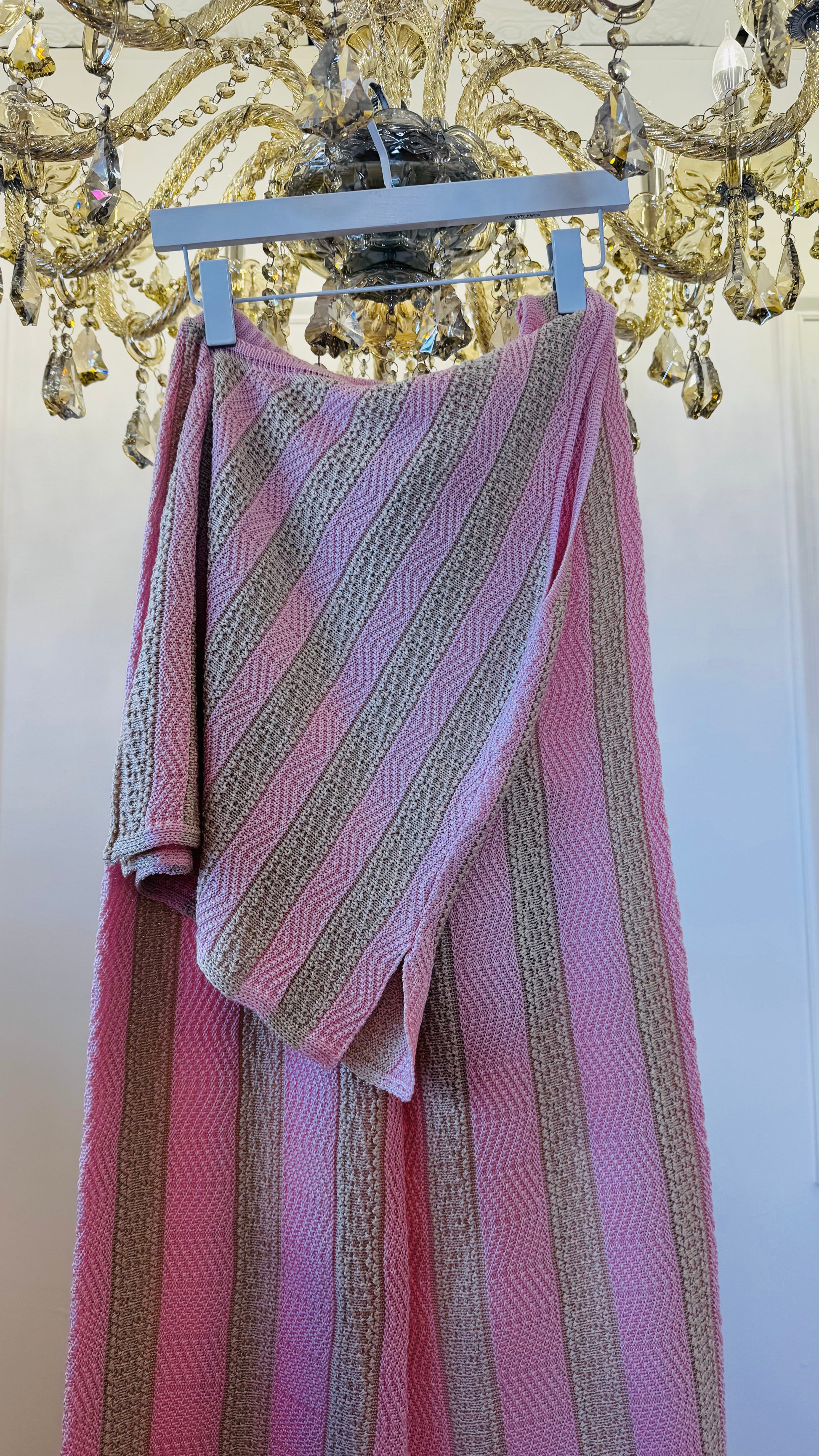 Made from a soft, breathable weave with vertical golden and blush stripes that elongate the silhouette, it’s perfect for sunny days, brunch dates, or stylish travels.